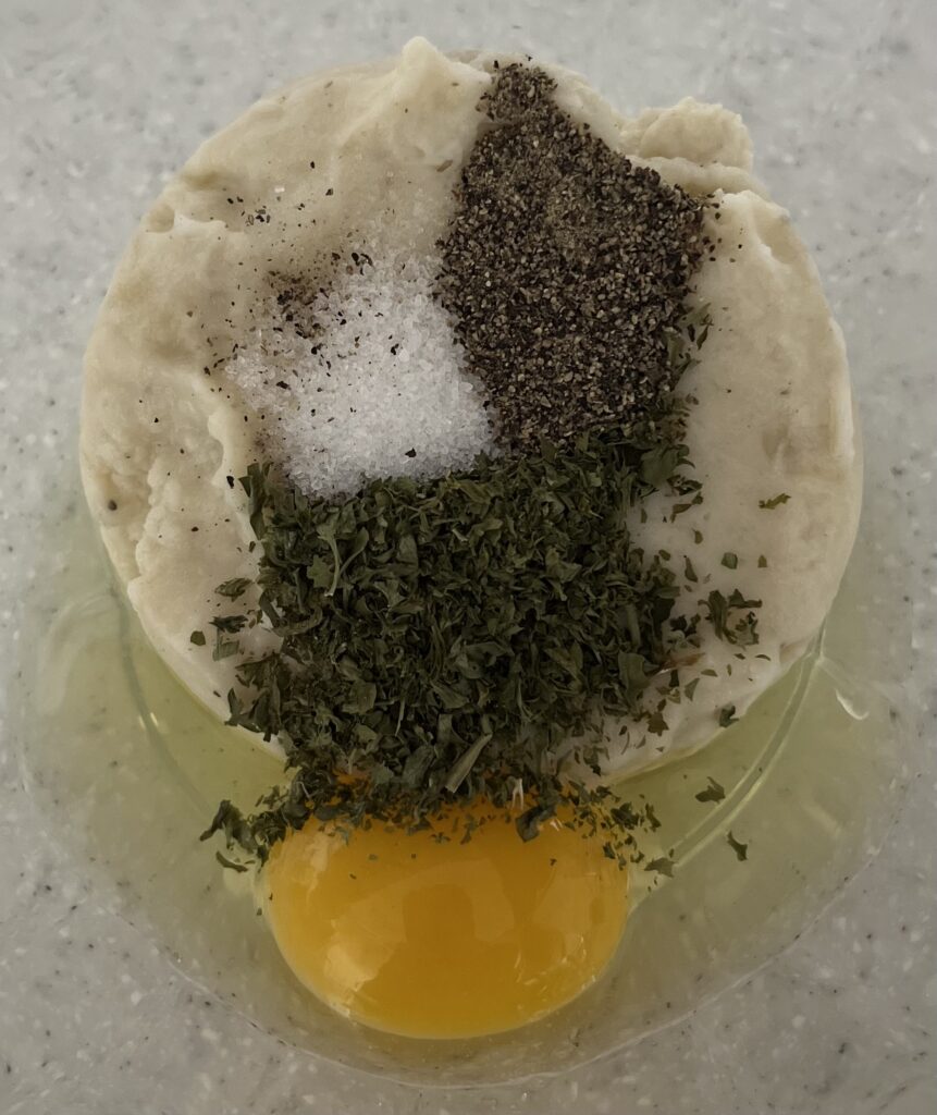 In a small, slightly beat the egg and set aside. In a medium bowl, add the flour, cheese, spices and mix well. Add in the cold potatoes and beaten egg. Combine well with a wooden spoon. Take a spoonful and form into golf ball sized balls and coat in breadcrumbs on both sides. Flaten slightly and lay onto a parchment-lined tray and chill in the refrigerator for at least one hour.