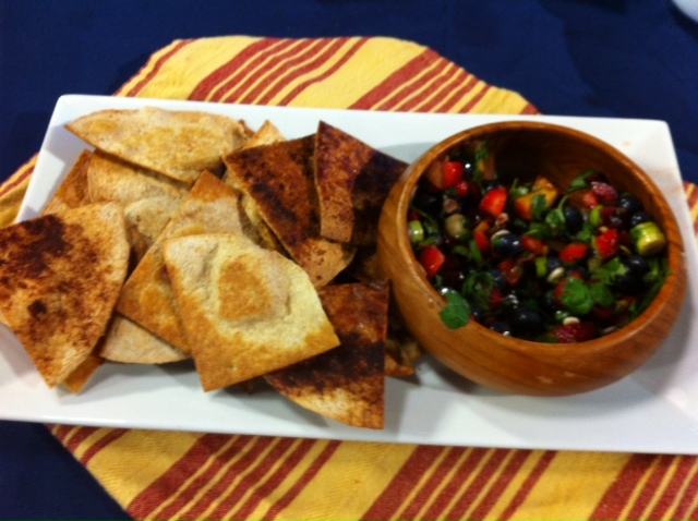 Cut each whole wheat tortilla round into 8 pieces, cutting as pie slices. Brush with olive oil, and sprinkle with sugar and cinnamon. Bake at 400 degrees until lightly brown, approximately 5 to 7 minutes. Dip into the salsa…enjoy!