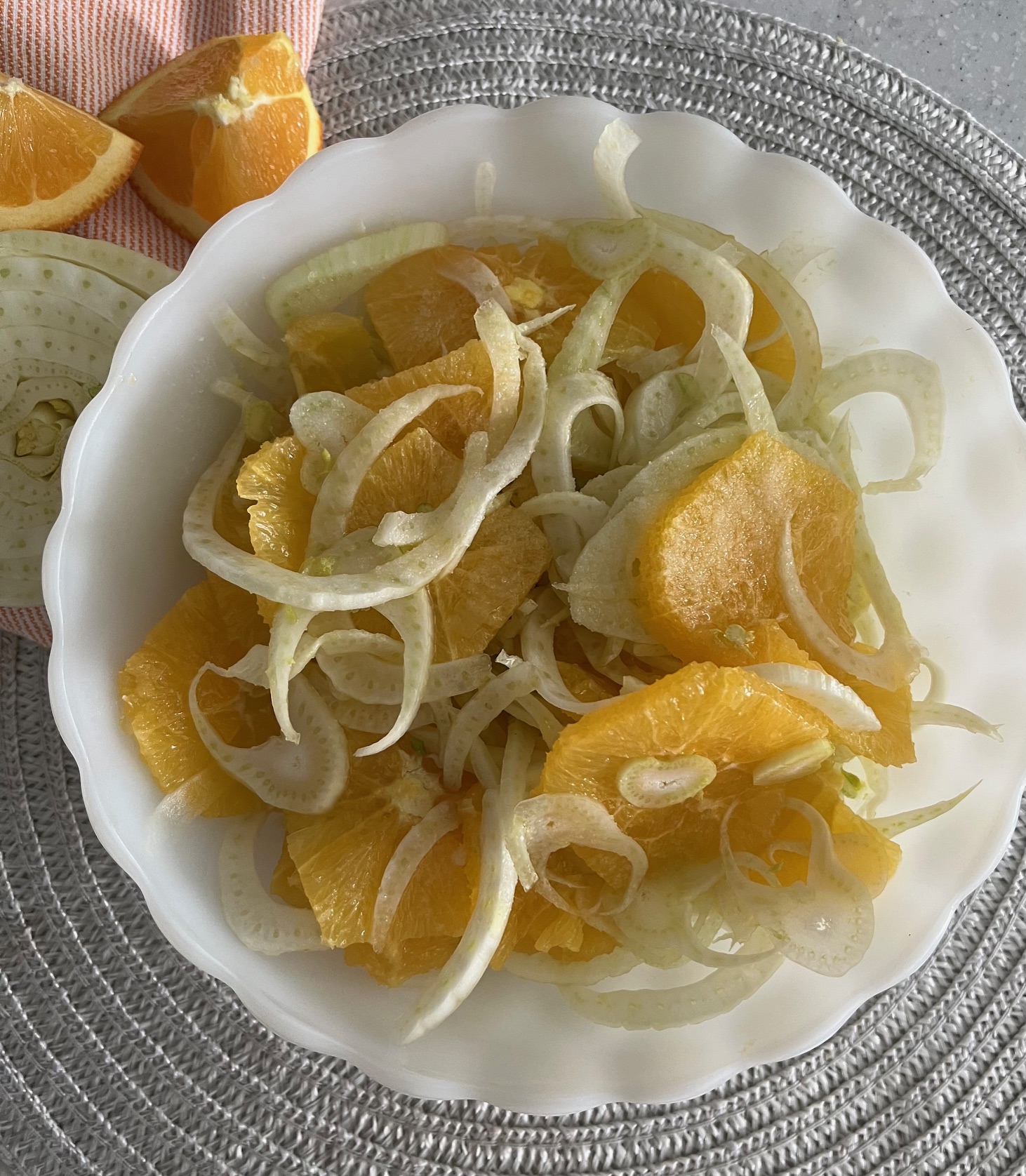 The combination of fennel and orange is actually delightful. Fennel has the flavor of licorice, and served raw, it is loaded with fiber. The oranges are the perfect marriage. Fennel will oxidize, so the juice from the oranges will prevent the oxidization. This is a fresh, cleansing, crisp salad, making it a great accompaniment to chicken or pork, especially.