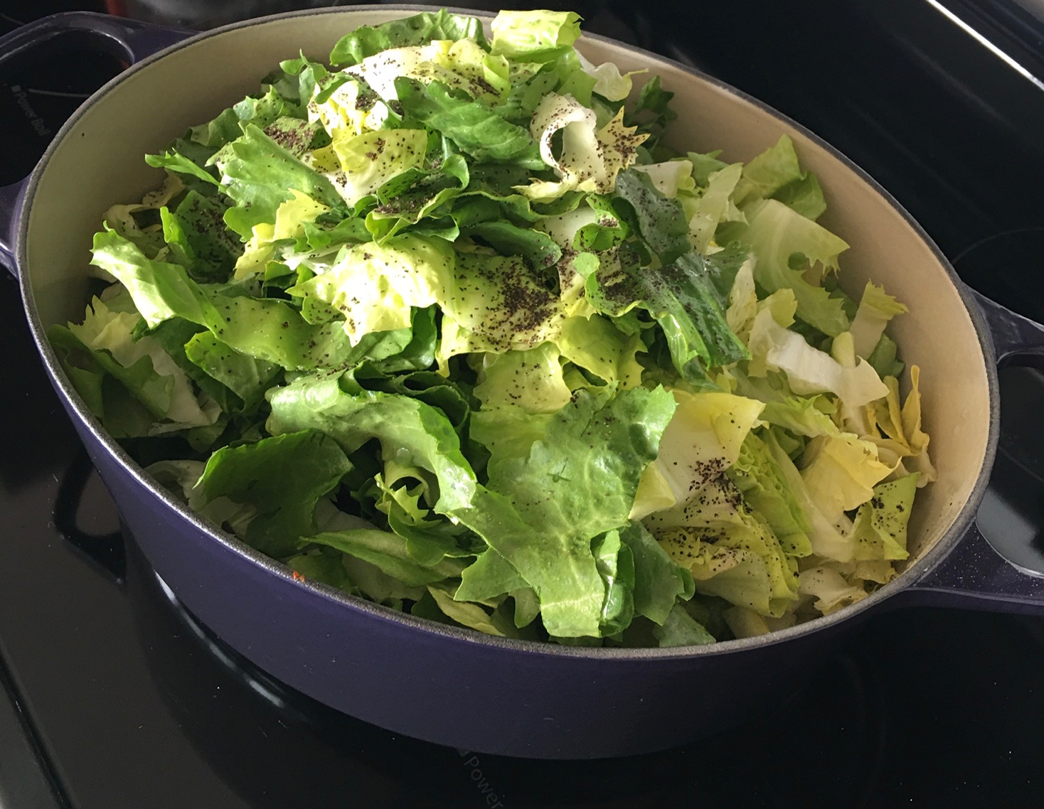 We begin with the washing X3 and then…with a good, sharp chef knife and cutting board, start chopping. It looks like a lot of greens as you begin filling up the stock pot, but they will cook down. You also want a good stock pot with a nicely-fitting lid, which is a good investment in your cooking if you’re going to making soups and sauces.
