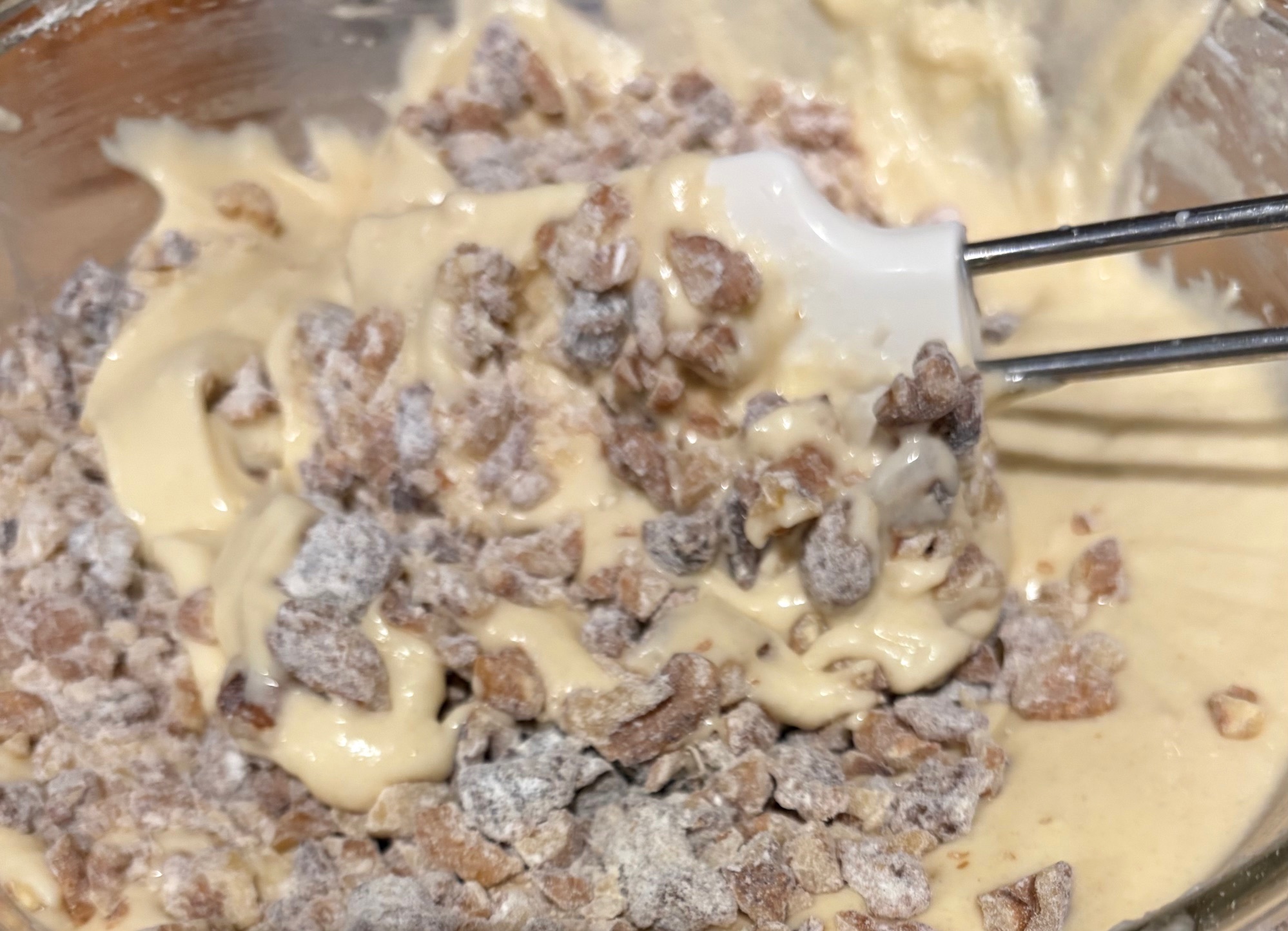 Take the reserved flour and add both the dates and nuts all to a small bowl and toss well to coat in the flour. This is all so that the dates and nuts don’t sink to the bottom of the pan while baking. Now fold them into the batter with a spatula until combined into the batter and pour into the prepared baking pan.