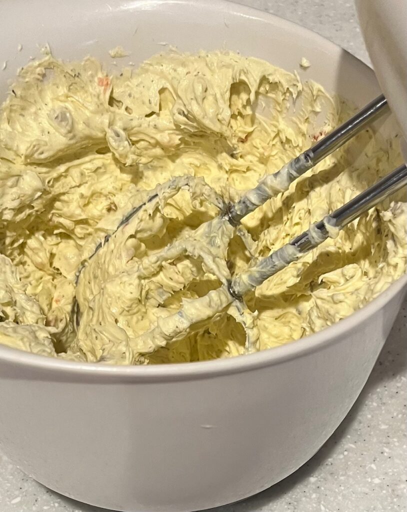 Remove the egg shells and egg white from the hard-boiled eggs. In a mixing bowl, add the hard-boiled egg yolks, softened cream cheese, garlic salt, dill weed, and sliced green olives. Mix all well with an electric mixer until well-combined.