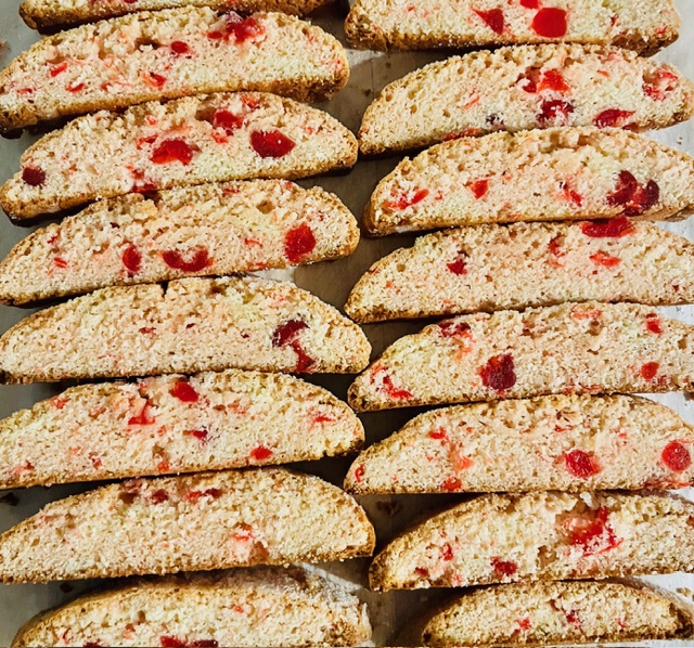 This Valentine’s Day, bring a little extra love to your kitchen with my Cherry Biscotti Recipe—a festive twist on the same chocolate chip biscotti featured on my recent ‘WTAE-TV ‘Cookie Town‘ segment and also a favorite in my cookbook, MaMa Mia Cucina. By simply swapping chocolate chips for (well-drained) maraschino cherries, you create a sweet, ruby-red treat that’s as beautiful as it is delicious. A totally new flavor by a simple substitution. These twice-baked Italian cookies are a soft-crisp, flavorful, and irresistible when dipped in coffee, tea, or hot cocoa. Whether you’re baking for someone special or preparing pretty packages for friends, this homemade Valentine’s Day cherry biscotti adds a heart-warming touch to any celebration.